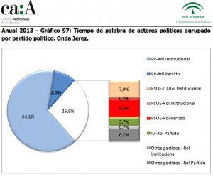 El Consejo Audiovisual de Andalucía (CAA) acaba de publicar su informe anual sobre el Pluralismo Político en las Televisiones Públicas de Andalucía de 2013 y Onda Jerez, un año más, no sale bien parada. De hecho es María José García-Pelayo la alcaldesa que más abusa de 'su' televisión local de los principales municipios de la región y únicamente igualada por la también dirigente popular Esperanza Oña. Ambas acaparan un 33% de cuota de pantalla en los informativos de las respectivas emisoras locales. En el caso de Jerez, el Partido Popular, tanto en su rol institucional como de partido, consume el 73,1% de los tiempos de palabra de los informativos de la cadena pública frente al 26,9% que se dedica a los diferentes partidos de la oposición. Onda Jerez cuenta este año con un presupuesto de 3,5 millones de euros, si bien la idea pasaba por reducir ese coste con bajas voluntarias (20) y con un ERTE que iba a afectar a 53 trabajadores. Todo esto está en el aire en estos momentos a raíz de que la Autoridad Laboral comunicara el pasado viernes que dicho ERTE no es aplicable a un ente de titularidad 100% pública.