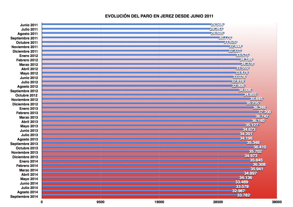 Más allá de lo absurdo de intentar presumir de que más de tres años después Jerez siga estancada en las mismas cifras insoportables de paro, hay que añadir, en primer lugar, que la realidad de los datos dicta que cuando Pelayo cogió el bastón de mando, junio de 2011, las cifras de paro marcaban un total de 29.506 inscritos en la lista del SAE. Esto significa, no solo que no había 32.000 parados y paradas cuando arrancó la legislatura, como ella asegura tajante, sino que en lo que va de su mandato se han sumado 4.276 jerezanos y jerezanas más a la lista de demanda de empleo.