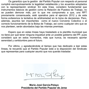 Al tiempo, la ahora alcaldesa llegaba a prometer que "la plantilla municipal no tiene por qué tener ninguna inquietud ante un posible gobierno de este partido porque en estos momentos, más que nunca, es necesario aportar serenidad y certidumbre para el futuro". Pese a negar recién aterrizada en la Alcaldía la aplicación de medidas traumáticas, la realidad es que Pelayo dejó pasar las elecciones generales y las andaluzas de 2011 y 2012, respectivamente, para anunciar un ERE para 260 empleados públicos, a los que se sumaban otros 60 de Onda Jerez y otro 25% de las plantillas del holding municipal.