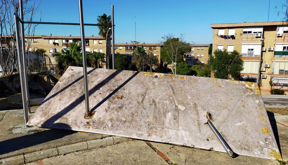 El andalucista explica que aún permanecen sin retirar tanto el techo de la marquesina que se desprendió de la parada de autobús como el vallado perimetral de la pista deportiva, que se salió de sus puntos de anclaje y sigue tirado sobre el suelo.