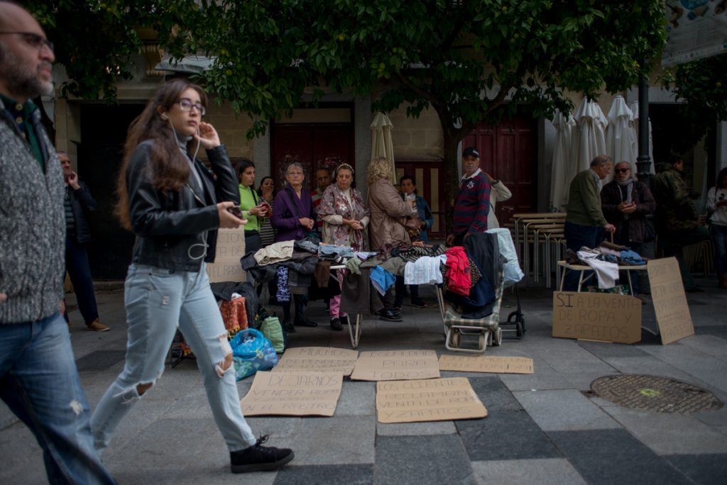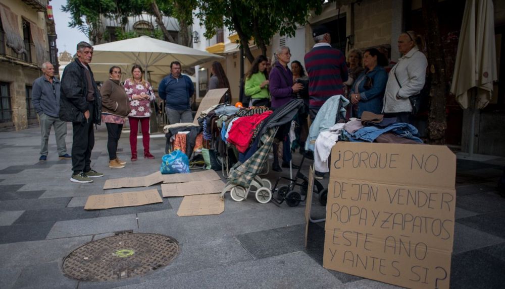 Momento de la concentración frente al Ayuntamiento. FOTO: MANU GARCÍA.La vendedora cree estar ante un conflicto de intereses que afecta a "400 personas que venden de todo", además de ropa. "Somos unas familias que se están buscando la vida sin hacerle la competencia a nadie", comenta. Sobre eso mismo incide, y se pregunta a quién perjudica el colectivo. "¿Al que está empoderado de Jerez que ha monopolizado toda la ropa? ¿A esas asociaciones sin ánimo de lucro que venden ropa y nada más que saben enriquecerse?". Y se responde a sí misma. "A esa gente. Yo creo que la historia va por ahí. Están metidos ahí... y venga licitaciones. Lo nuestro no es ilegal, será alegal, que nos busquen una forma". Y carga contra los puestos de recogida de ropa usada. "Si antes había 100 contenedores de Madre Coraje, Cáritas ha puesto ahora 500 para resacirse del tiempo que ha estado. Vas por la calle y ves un champiñón de color rojo, otro champiñón de color verde, otro blanco. ¿Y esta gente para qué cogen la ropa? ¿Para beneficiar al pueblo? Mentira, porque vas a la tienda y vale más cara que en el Zara, y además es mala".