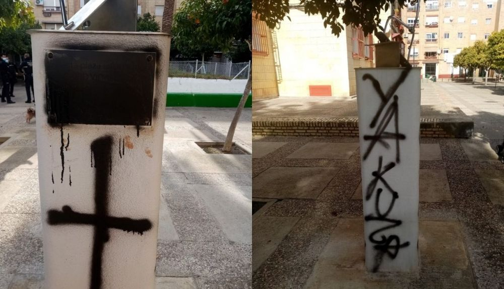 Además de pintar de negro la placa en recuerdo de David Vidal Cala, este individuo ha intentado arrancar la figura con el skate que honra la figura de uno de los primeros skaters de Jerez. Además, en uno de los laterales del muro del monolito ha pintado la palabra Yacuza, una palabra que ha reproducido en muchas paredes del barrio.