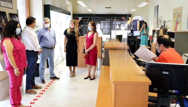 La delegada de Turismo, Comercio y Consumo, Isabel Gallardo, acompañada del presidente del Clúster Destino Jerez, Antonio Mariscal, y del representante y empresario de Horeca, Francisco Díaz, asistieron hace unos días a la reapertura de la Oficina Municipal de Turismo. Un turista nacional y una turista inglesa han sido los primeros en pedir información en este servicio municipal. Todos los presentes en el acto se han mostrado esperanzados de la recuperación de los turistas porque Jerez tiene “una oferta cultural, patrimonial y turística inmejorable”, ha afirmado Isabel Gallardo. Las instalaciones de Oficina Municipal de Turismo han sido acondicionadas conforme a las medidas sanitarias exigidas por el Covid-19. Los accesos están señalizados con entrada y salida; se exige el uso preceptivo de mascarillas; se han colocado geles hidroalcohólicos y marcado las distancias. Pero además, la Oficina Municipal de Turismo ha reabierto mostrando en su fachada imágenes promocionales (en forma de vinilo) del caballo de PRE, el flamenco y el vino de Jerez, todo ello junto un plano informativo de Jerez y la provincia de Cádiz, que incluye códigos QR para acceder a la web www.turismojerez.com y redes sociales. La delegada Isabel Gallardo manifestaba en el acto de repaertura “su convencimiento pleno de que el turismo se va a recuperar. Jerez es una ciudad magnífica, hemos trabajado el sector turístico y nuestra oferta como ciudad cultural, patrimonial y turística es inmejorable”, incidía. Las medidas adoptadas tras la pandemia obligan a reorientar el turismo, según la delegada municipal. “Tenemos una oferta que no está saturada, no tenemos un problema de excesivas aglomeraciones y, bueno, este fin de semana ya hemos visto como la ciudad se ha ido normalizando en tono a las visitas. Ha habido más afluencia de turistas por las calles. Además hemos reorientado las políticas turísticas. Vamos a ser un turismo diferente”. Y ha añadido que “este verano vamos a tener turismo, un turismo saludable y muy positivo para la ciudad”, enfatizaba Isabel Gallardo.