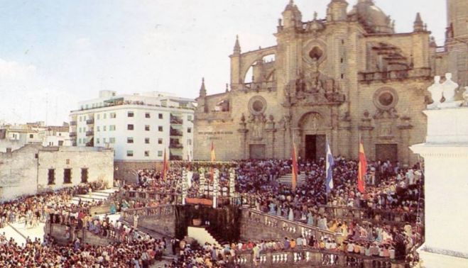 ¿Ven esa foto? Tiene 55 años. El reducto de la Catedral es un auténtico hormiguero de personas. El lagar, escenario de la simbólica celebración, ocupa el espacio central de este entramado mediante al que se accede a la antigua Colegial. Desde entonces, nada ha cambiado en cuanto al desarrollo del evento. La escenificación, la figuración, los pasadobles, las fuerzas vivas... El modelo del acto de la Pisa de la Uva, que debería ser el acto central de una de las que deberían de ser las Fiestas de la Vendimia más importante de España, está caduco. Cada vez atrae a menos público, no sabe cómo reinventarse, y para colmo, raro es el año que no se ve deslucido por las protestas o por cualquier contratiempo. El año pasado faltaron las jóvenes vendimiadoras, cuya ausencia provocó un cisma entre los que normalmente acuden al evento —cada vez menos—, mientras que la banda municipal también estuvo a punto de no tocar Paquito chocolatero por los impagos del Ayuntamiento.