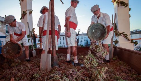Esperando sobre el lagar, con las palas preparadas para distribuir el contiendo de las canastas, los pisadores, vestidos de blanco con fajas rojas calzando botas de clavos para estrujar la uva -a la antigua usanza-, calentaban las piernas antes de iniciar el rítmico compás de la pisa. Es el conjunto de elementos consustanciales a esta cita que sigue despertando emociones, pese a que lo sentimental del ‘nacimiento el nuevo vino’ haya venido a menos.