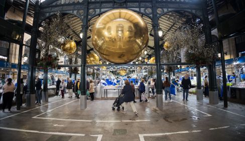 Grandes bolas doradas de Navidad y detalles arbóreos conforman una decoración muy cuidada que adorna desde puestos de recova, frutas y verduras hasta la clásica nave del pescado, con una impresionante bola gigante que da la bienvenida a los clientes y visitantes.