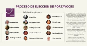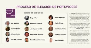 El Círculo Podemos de Jerez elige este sábado las seis caras que ejercerán de portavoces ante los medios de comunicación de ahora en adelante. Al proceso, que tuvo lugar el pasado 1 de julio, se presentaron once hombres y tres mujeres, que al ser las tres únicas serán las elegidas para llevar la comunicación de la formación, ya que la lista es cremallera y deben salir de ella tres hombres y tres mujeres. La votación tendrá lugar a las 10:30 horas en el templete municipal del parque González Hontoria, donde cualquier ciudadano podrá votar a los candidatos y donde también se realizarán las jornadas de elaboración del reglamento interno de Podemos Jerez.