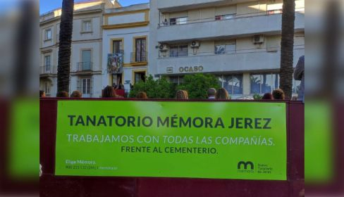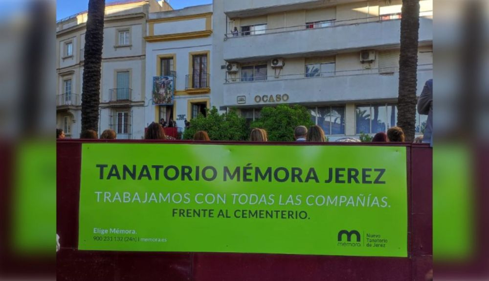 Una publicidad de un tanatorio en un palco de la Carrera Oficial de Jerez situado frente a una oficina de seguros Ocaso está dando mucho de que hablar.