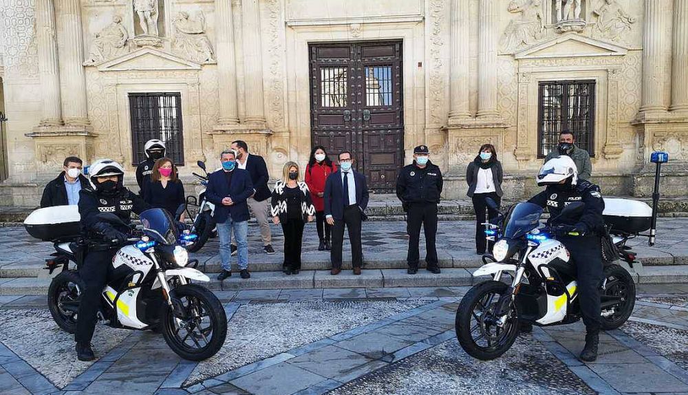 La alcaldesa, Mamen Sánchez, acompañada por el delegado en Andalucía de Red Eléctrica Española, Jorge Juan Jiménez, ha presentado este viernes las tres nuevas motocicletas para la Policía Local, que son fruto de un convenio de colaboración entre el Ayuntamiento y esta compañía para mejorar y ampliar la dotación de medios del cuerpo con vehículos ecológicos, eficientes y no contaminantes.