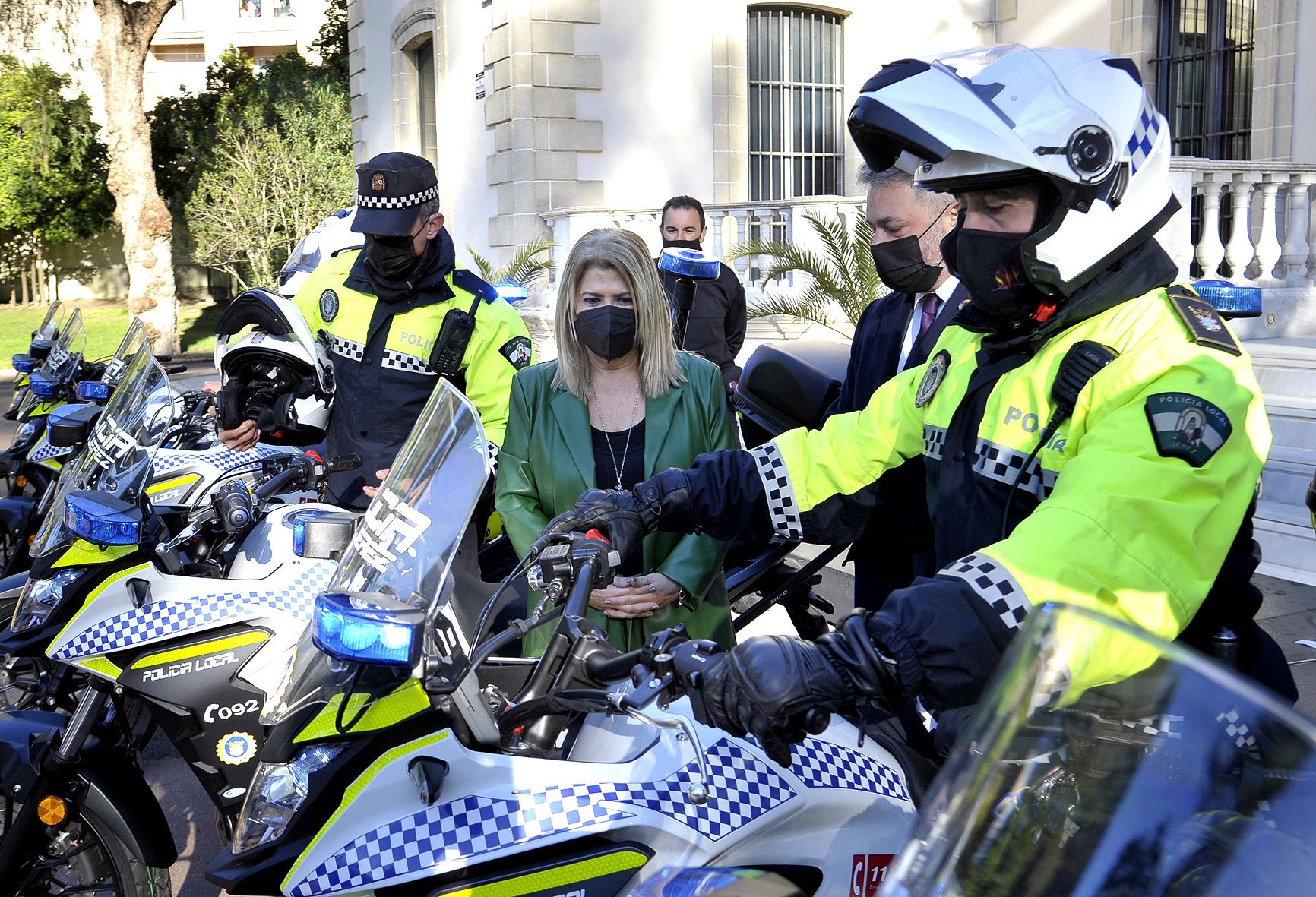 La alcaldesa de Jerez, Mamen Sánchez, ha presentando las nuevas motocicletas que se incorporan al parque de vehículos de la Policía Local. Lo ha realizado frente al Palacio del Tiempo acompañada por el delegado de Seguridad, Rubén Pérez Carvajal, y el jefe de la Policía Local, Manuel Benítez.