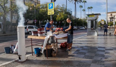El producto base, la castaña, vuelve a ser más cara, un golpecito en el precio, como también es costumbre cada año que pasa. Sí se desea una inmersión en el otoño en Jerez, junto a la caída de las hojas de las plataneras, también se puede tantear las castañas muy calientes en papel de estraza y meter en ambiente el cuerpo y los ánimos aunque la atmósfera no acompañe, todavía.