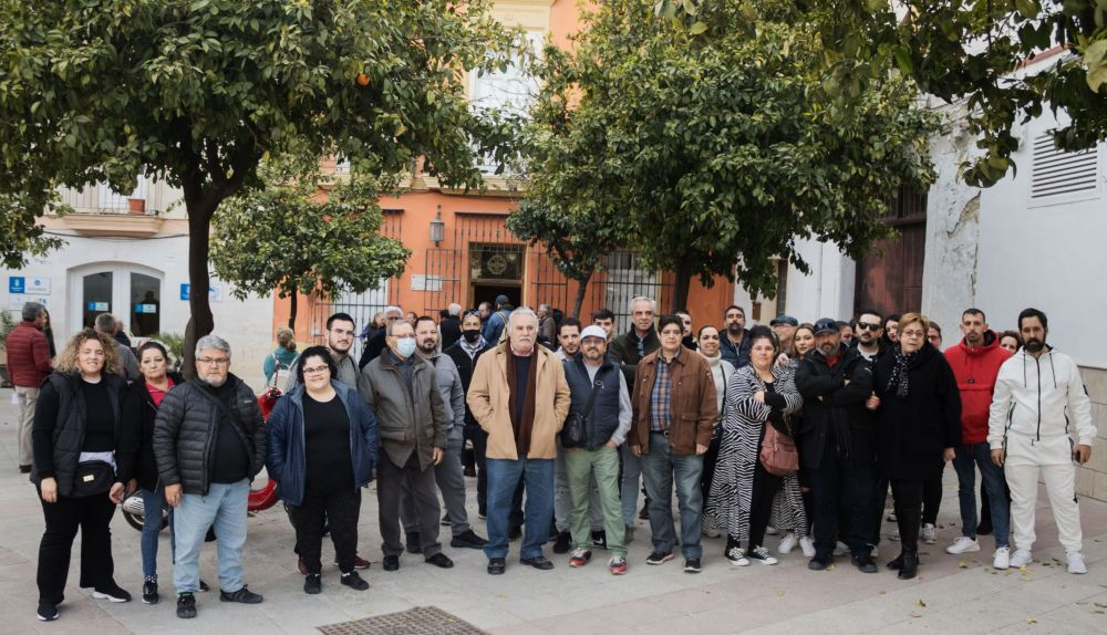 Un numeroso grupo de personas que representa a los más de un centenar que cada año se ocupa del servicio de instalación y recogida de sillas, inspección y acomodadores en la Carrera Oficial, se ha concentrado ante la sede de la Unión de Hermandades para protestar por la decisión del organismo cofrade de contratar este año el servicio con una empresa externa y que esta no cuenta con ellos para esta Semana Santa.