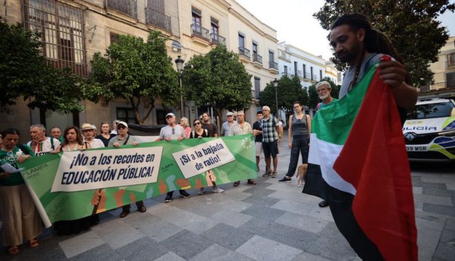 Una concentración, mientras se celebra el pleno de junio en el Ayuntamiento de Jerez, tiene lugar en la puerta de la casa Consistorial para protestar por el estado de la Educación pública. Contra la privatización de la FP, aclaran sus convocantes.
