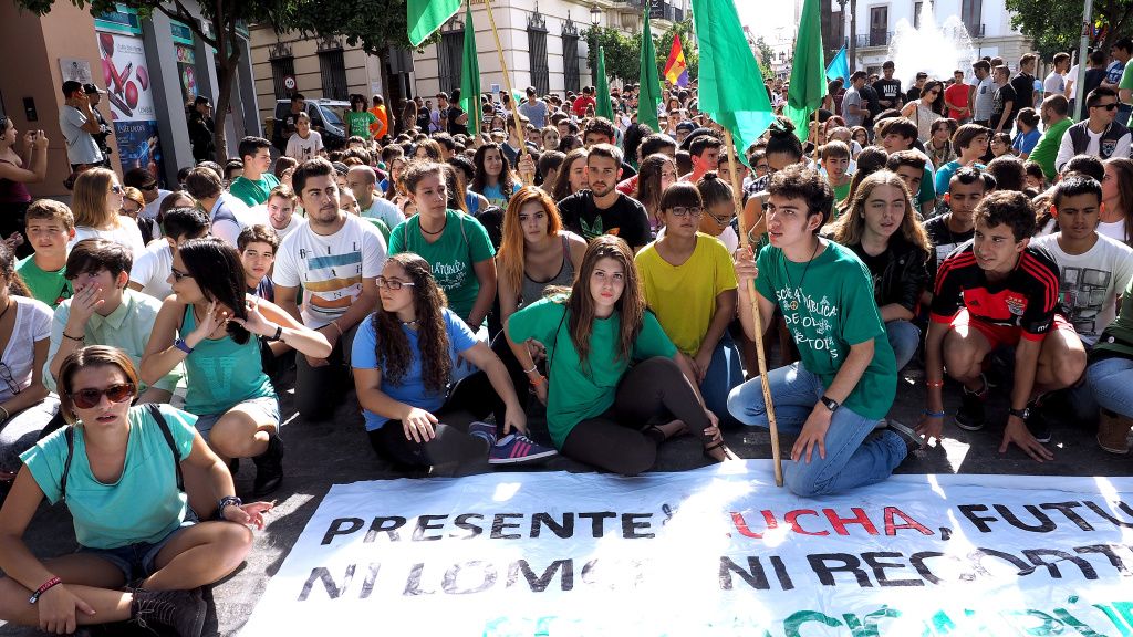 "Presente de lucha, futuro digno. Ni Lomce ni recortes en la educación pública", rezaba en la que presidía la manifestación. "Lomce insumisión; IES organizados y en lucha", ponía en otra en la que también estaban los nombres de los institutos Padre Coloma, Seritium y Caballero Bonald.La tercera jornada de huelga estudiantil convocada por el Sindicato de Estudiantes a nivel nacional se dejó notar en la ciudad con una marcha que fue ganando participantes conforme iba avanzando y que estuvo