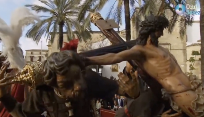 Estaba discurriendo el paso de misterio de la hermandad de la Exaltación, de la barriada de las Viñas de Jerez, por Carrera Oficial cuando tuvo lugar un desencuentro que su hermano mayor no pasó por alto.