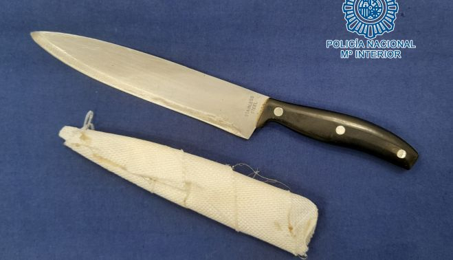 Se da la circunstancia de que cuando los agentes de la Unidad de Motocicletas de la Policía Nacional, los cuales se desplazaron al punto de forma inmediata una vez la sala operativa CIMACC 091 recibió la alerta de lo que estaba ocurriendo, interceptaron al individuo y procedieron a realizarle un cacheo preventivo de seguridad, descubrieron que el mismo se encontraba armado con un cuchillo de grandes dimensiones, de más de 18 centímetros de hoja, el cual encontraba modificado en su mango y era portado por el detenido en una funda artesanal realizada al parecer por él mismo.