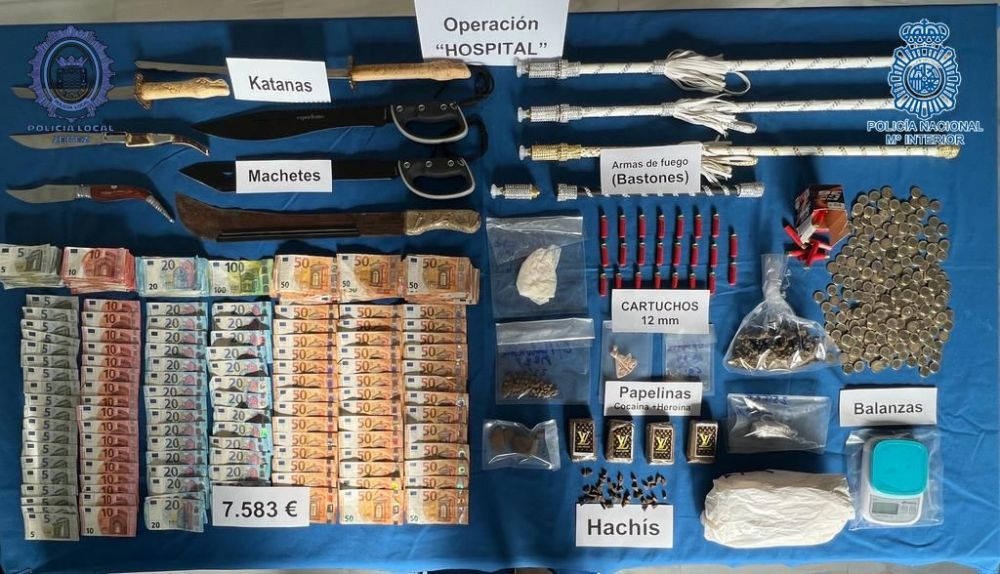 En la intervención se han encontrado cuatro armas de fuego tipo bastones detonadores, un arma de fuego consistente en una especie de vara metálica hueca a modo de cañón junto con una empuñadura que alberga una recámara y un sistema percutor, todo el sistema habilitado para poder hacer fuego con cartuchos de caza de 12 milímetros, junto a ellos 40 cartuchos de esa misma munición, ocho armas blancas, todas ellas de gran tamaño y capacidad lesiva compuestas por tres machetes, dos katanas y dos tipo navaja de gran longitud de hoja, junto a esto diferentes útiles para manipulación, balanzas de precisión, y envasado de la droga, 7.583 euros y un vehículo de alta gama que igualmente fue intervenido.