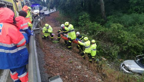 El rescate de esta persona ha sido complejo: los Bomberos han quitado la luna delantera del coche, extrayendo el techo del mismo, asistiendo después al accidentado con un collarín. Acto seguido, ha sido trasladado a la camilla nido, desde la cual, a través de sistema de cuerdas y la tracción de poleas, se le pudo incorporar a la calzada.