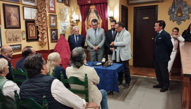 El acto tuvo lugar en la sede del colectivo y se presentó también el cartel que edita, obra de Juan Ángel González de la Calle. El director espiritual de la hermandad, el hermano mayor y directivos de la entidad rociera presidieron el acto.