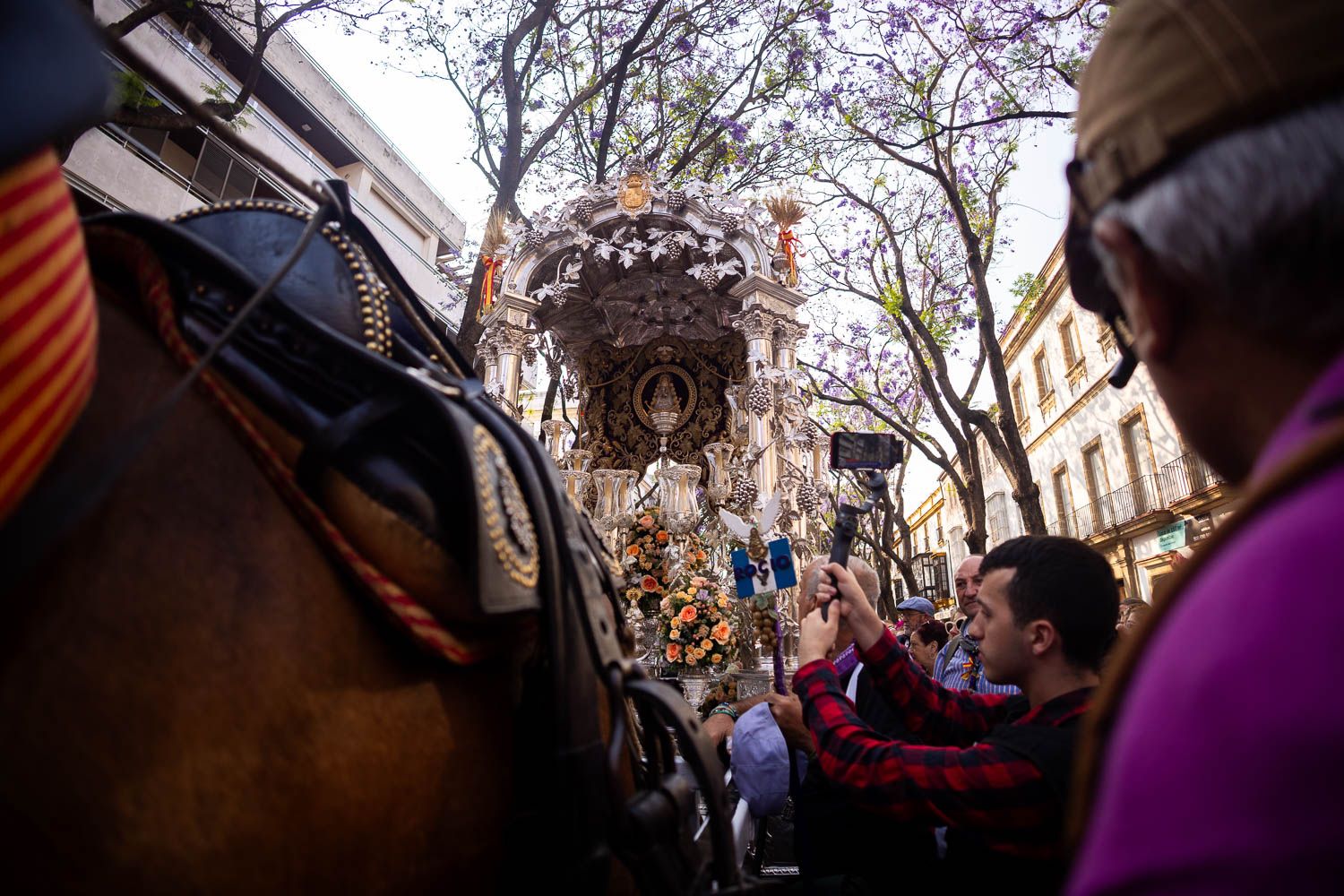 Seguidamente, la caravana se pudo de nuevo en marcha para adentrarse en la entrañas de Doñana por una castigada rodá con las arenas muy sueltas debido al tránsito de las ocho hermandades que preceden a la de Jerez. Una circunstancia que no es novedosa y que castiga a los tiros de animales y vehículos.