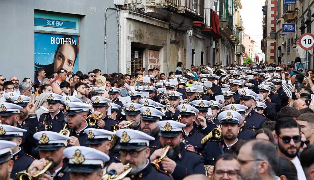La banda del Rosario marcó un antes y un después en la salida de la Entrega. Desde que la formación gaditana se incorporó, la crónica pasa de la relativa tranquilidad de una ida con su gente alrededor y del público justo en las aceras y balcones, a la muchedumbre, algo que da que pensar si el personal viene atraído por la banda o por una hermandad que lleva desde las doce y cuarto del mediodía en la calle.