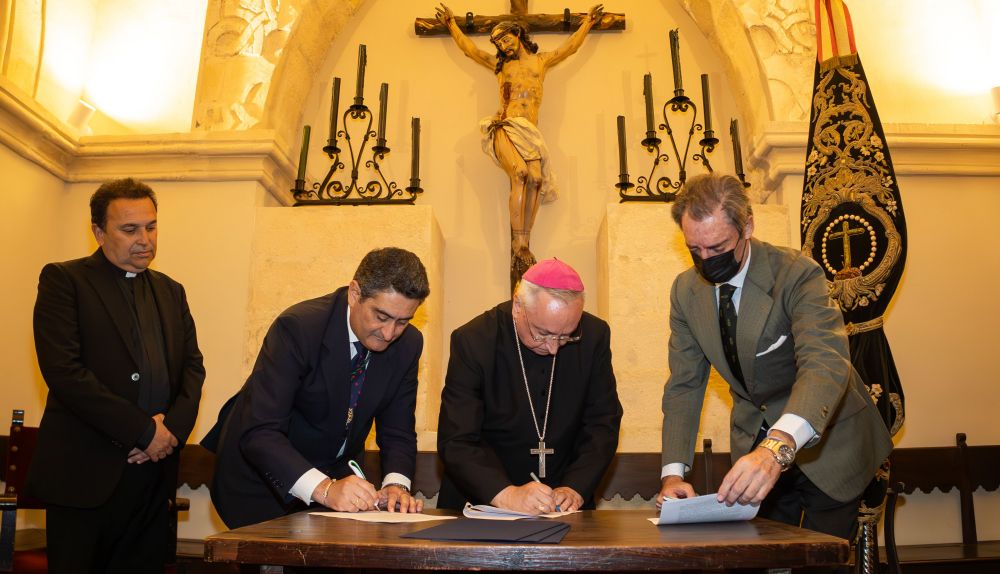 En un acto celebrado en las dependencias de la Hermandad de la Vera Cruz, el obispo Rico Pavés, el presidente de la Fundación del Hospital de la Resurrección, de Utrera, Luis López de Carrizosa Caballero; el hermano mayor, Manuel Báez, y el exhermano mayor, promotor inicial del proyecto, José Ignacio Soto, han presidido el acto de firma de un convenio mediante el cual la Fundación acometerá las obras de restauración y adaptación de una cripta funeraria de unos 40 metros cuadrados que se localiza bajo la sacristía del templo.