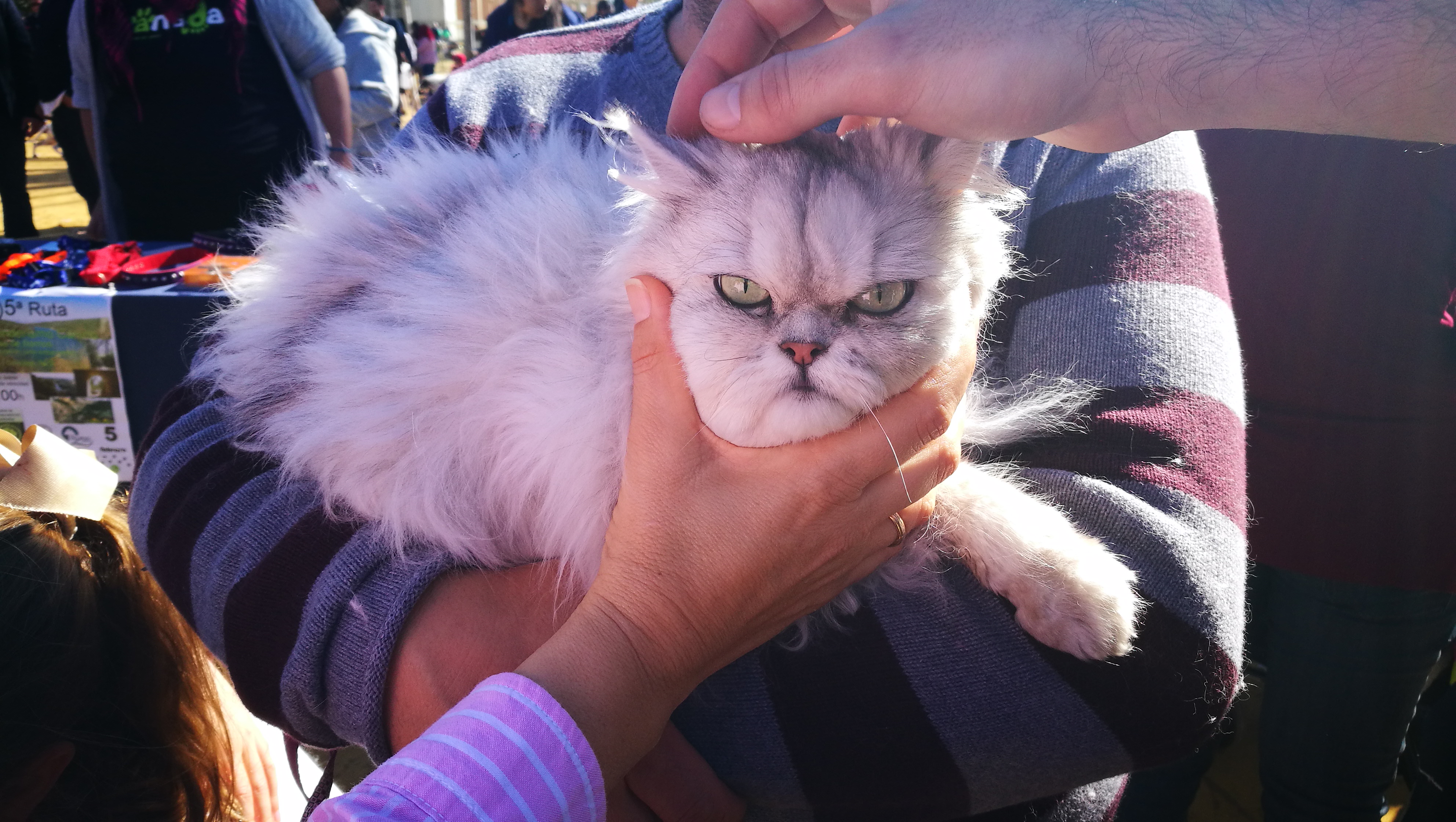 San Antón podría ser la fiesta de Fin de Año de las mascotas. Un lugar amplio, alejado de petardos y con una gala en la que algunos hacen acto de presencia en sociedad. Por ejemplo, para Frozen, una gatita mitad persa y siamés, es la primera vez que acude a dicho encuentro. Su entrada es triunfal, su familia la trae dentro de un carrito de bebé de juguete. “Como se asusta, preferimos traerla así, pero ella es muy buena”, comenta su dueña mientras la gata se enrosca dentro del carro dejando ver únicamente su peluda cola. Nieves, una gata persa chinchilla, duerme sobre el brazo de su dueño. Ya está acostumbrada a estas fiestas, ella es una de las pocas gatas veteranas, ya que pocos felinos se contemplan en un día copado por perros. Los humanos, entre un sol que ciega los ojos y una brisa inexistente, buscan, algo perdidos por el efecto climático, algún animal fuera de lo común, alguna raza poco habitual y sobre todo, a alguna mascota que no fuera un can.
