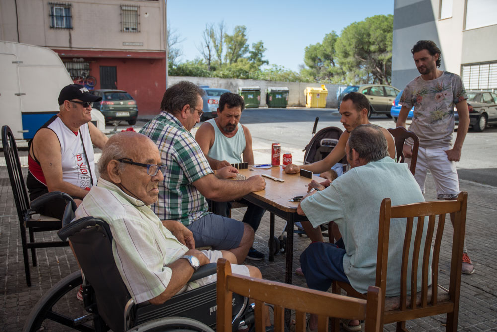 En torno a una rudimentaria mesa colocada en plena calle, hombres de diferentes edades juegan al dominó. “En esto nos entretenemos”. Esta estampa costumbrista y anacrónica surge de manera espontánea fruto del desempleo y la indiferencia de las administraciones, aseguran. La ausencia del personal de la limpieza, el abandono de un solar próximo al Zoológico, y la falta de un parque infantil centran las quejas de los vecinos.