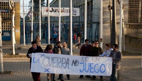La guerra no es un juego. Con esa premisa se han concentrado en la puerta principal de Ifeca, donde estos días tiene lugar Juvelandia, un grupo de personas para denunciar la celebración de actividades militaristas en la feria de ocio infantil y juvenil. "Es una barbaridad, este espacio tiene que tener contenidos educativos y la peor manera de divertir a los chavales es a través de vehículos militares", asegura Francisco Cuevas Noa, docente y miembro de CNT. Cuevas Noa apunta que "los niños no tienen capacidad crítica y a muchos les fascina el armamento, pero no son conscientes de lo malo que es en realidad". El año pasado, sin ir más lejos, "había tanques que se estaban utilizando en Afganistán", asegura este pedagogo.