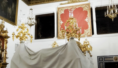 Los cuatro candelabros del paso de misterio de la Sagrada Cena de Jerez ya están colocados en el paso del Cristo de la Expiración de la Hermandad del Museo de Sevilla. La cofradía jerezana ha cedido temporalmente estas piezas, originales del prestigioso tallista e imaginero Antonio Castillo Lastrucci, para que formen parte del conjunto procesional con el que la corporación hispalense celebrará su 450 aniversario fundacional.