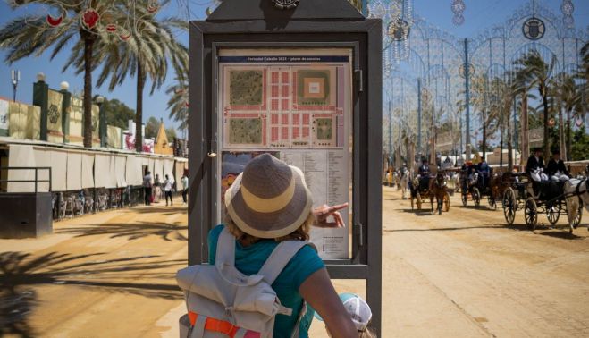 Una mujer, frente al plano de casetas de la Feria de Jerez.