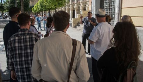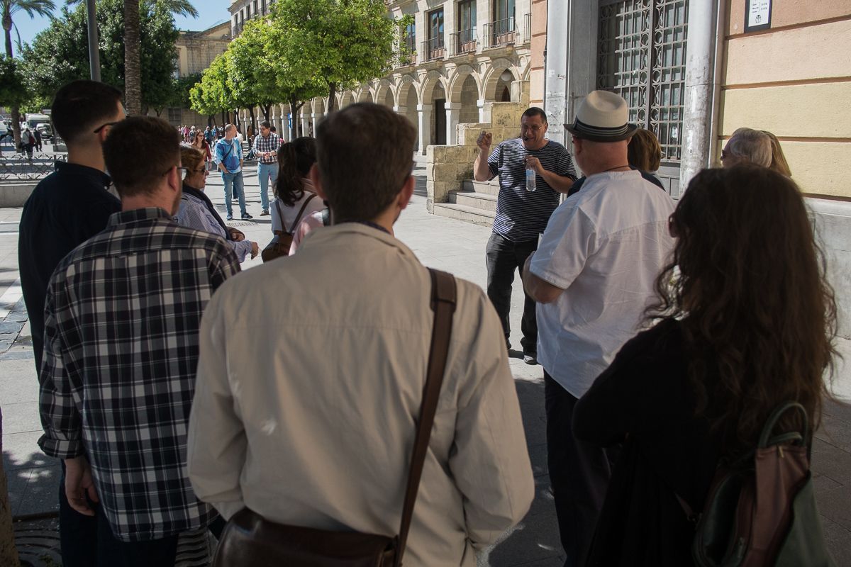 Justo detrás del Beaterio, un colegio de monjas que por aquel entonces ya existía, en lo que es la calle de las Cruces, el guía se detiene para observar la fachada de la vivienda de este reconocido activista libertario de Jerez. "Hoy la bandera nacional cuelga por sus balcones", dice con sarcasmo una de las asistentes. "La familia cuenta que a cualquiera que venía le decía: ponte ahí. Los sentaba en una mesa grande y a hacer tareas". Sobre la cercana escuela religiosa, Francisco cuenta una anécdota recogida también por testimonios orales: "Las monjas les decía a las niñas que no se equivocaran al ir a la escuela que ahí abajo estaba el diablo".