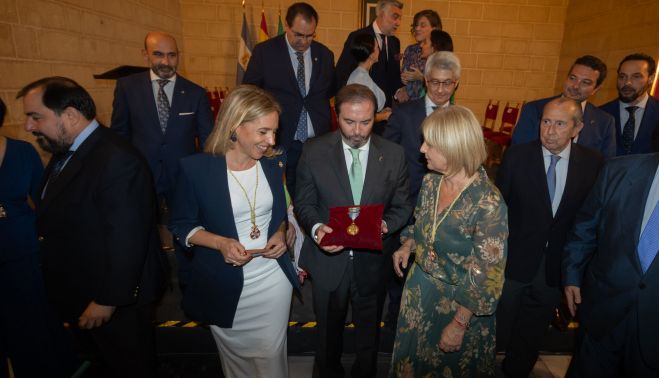 Con el fondo del pasodoble de honores ‘El Abanico’ entró la corporación municipal, precedida de clarineros y cerrando los maceros, como manda el protocolo municipal para los momentos solemnes. El pleno no estuvo al completo al faltar La Confluencia, que ya se posicionó en contra de este reconocimiento.