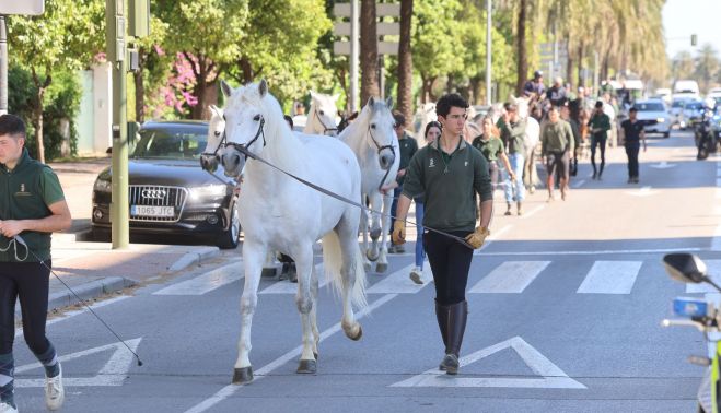 Una llamativa estampa han vivido en la mañana de este lunes los conductores que circulaban por la avenida Álvaro Domecq de Jerez, que se han encontrado con carruajes, caballos y jinetes de la Real Escuela Andaluza del Arte Ecuestre.