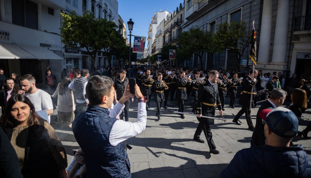 El primer domingo de Cuaresma ha traído a Jerez distintas actividades cofrades que han llamado la atención a los amantes de las bandas. Por la mañana, bajo un cielo despejado, la Agrupación Musical Virgen de los Reyes ha protagonizado un pasacalles por el centro de la ciudad.