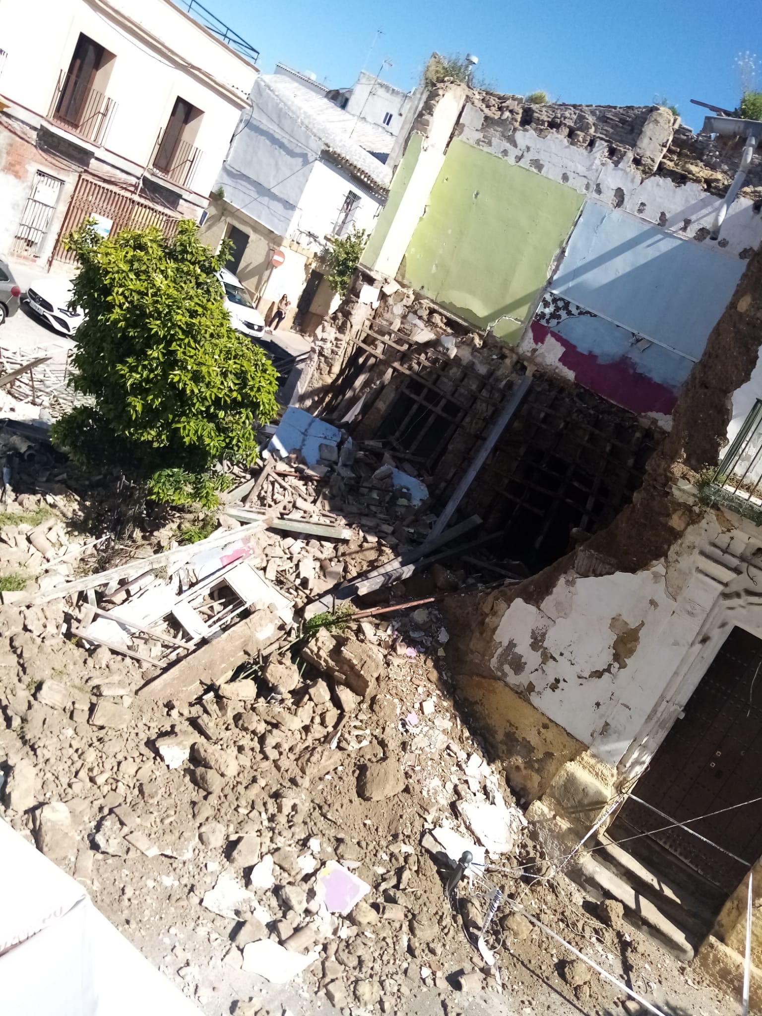 El centro de Jerez no gana para sustos últimamente y más después del derrumbe este pasado domingo de una casa en el barrio de San Miguel. Un inmueble del siglo XVIII que estuvo precintado meses atrás por unas obras ilegales y que había quedado con el techo al aire. Las intensas precipitaciones de hace unas semanas llevaron al empeoramiento, con desmoronamiento total de la edificación.