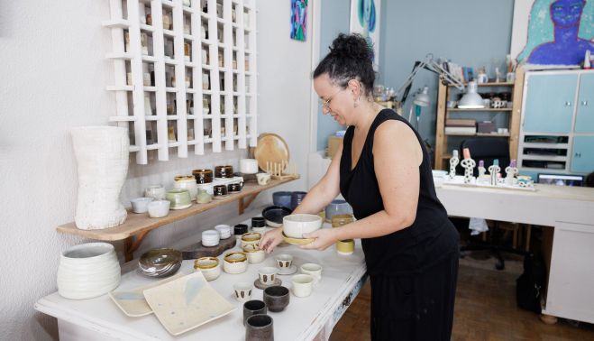 Trabaja lo que se denomina como joyería cerámica, “estoy especializada en la porcelana espacial para una joyería muy resistente; se pinta con oro y con diseños propios inspirados en la naturaleza”, explica Irene, que añade a la gama de productos la cerámica de uso alimentario y también la decorativa. Al catálogo se suman las creaciones de su marido, Felipe Mejías, que es ilustrador y se ocupa de las estampaciones en textil y en otros soportes.