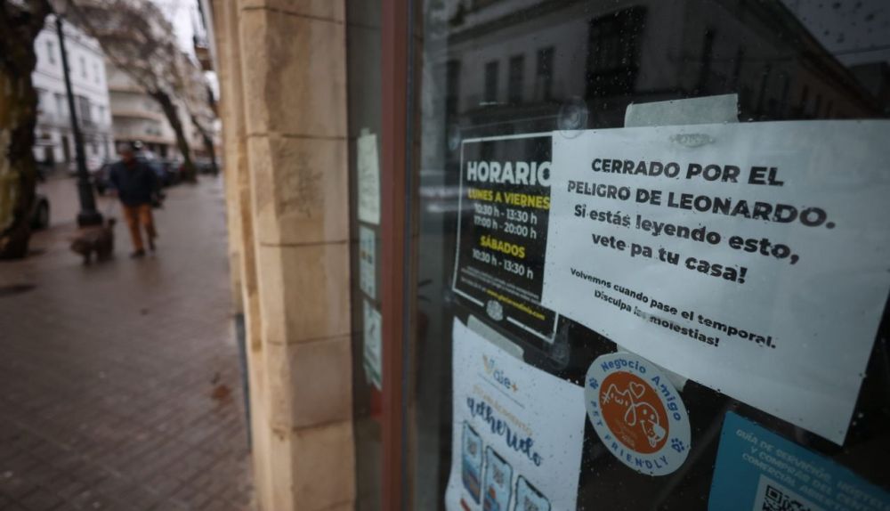 "Cerrado por el peligro de Leonardo. Si estás leyendo esto, ¡vete pa tu casa!", se puede leer en el cartel que la tienda tiene colocado en su puerta, en un centro de la ciudad en el que apenas hay negocios abiertos.