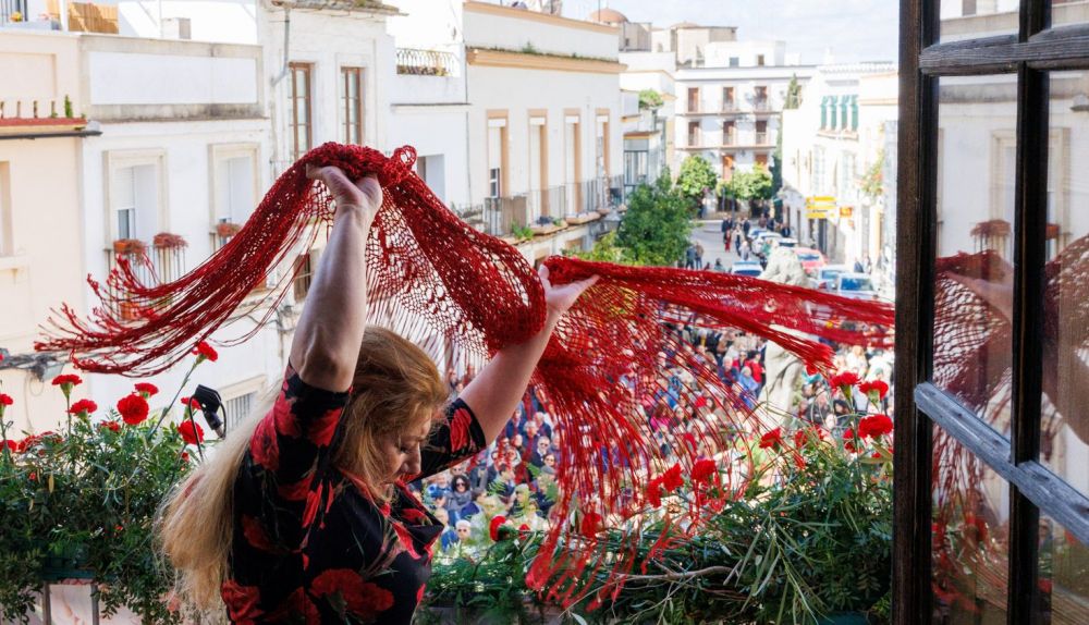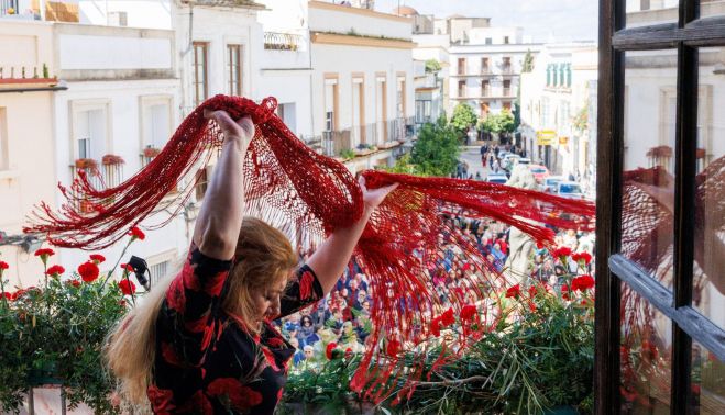 A las 13.15 horas, la cantaora y bailaora Mara Rey se ha asomado al balcón del Palacio Villapanés. Aunque nacida en Madrid, Mara Rey cuenta con profundas raíces flamencas jerezanas y ha compartido escenario con figuras como Miguel Poveda y Los Farruco. Su actuación rindió tributo a la artista homenajeada, en línea con el espectáculo que protagonizó en su honor en 2023.
