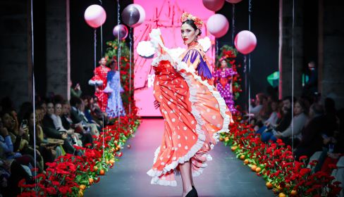 Con un enfoque en el patronaje innovador, su apuesta para este año jugaba con transformaciones arriesgadas que no perdían la esencia flamenca, entre estampados exclusivos, lunares tradicionales en popelín y raso, batistas perforadas, gasas, creps y tejidos bordados.