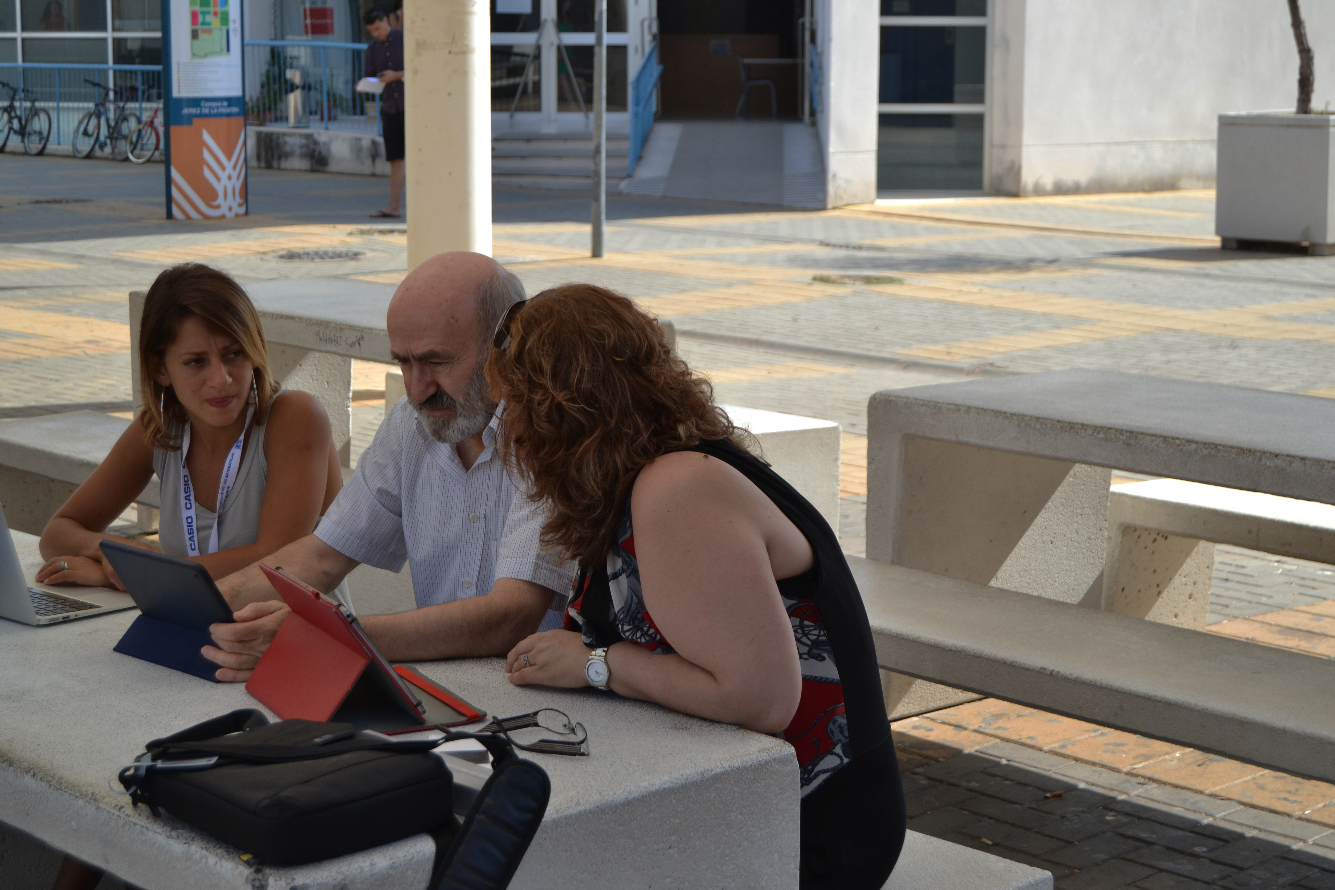 "A nivel andaluz el congreso de Thales es el más relevante, este está muy orientado a los profesores. No creamos matemáticas, sino su enseñanza", declara el profesor Díaz, quien ha preparado su taller de 'Reconocimiento de niveles de algebrización en educación matemática' en el patio del campus, acompañado de Patricia Konic, doctora en didáctica matemática que viene desde Argentina, y de Giacomone, alumna a la que le tutoriza la tesis. Ellos son un ejemplo de la amplia variedad de asistencia del congreso, ya que cuenta con la concurrencia de más de 200 hispanohablantes procedentes de países como Guatemala, Costa Rica, Argentina y Colombia.