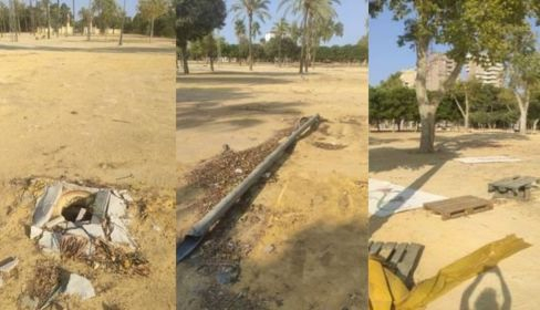 Paseando por el Real te puedes encontrar tuberías con filos cortantes, bajantes de los sanitarios de las casetas abiertos, restos de fachadas tirados por el suelo, alambres, puntillas y cristales rotos. El albero prácticamente ha desaparecido y son varios los boquetes que hay en la superficie.