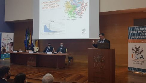 A continuación, el profesor José Antonio López ha pronunciado la lección inaugural “Los destinos turísticos inteligentes como paradigma de los destinos maduros” en donde ha señalado que “el turismo litoral es el principal espacio turístico”, pero se caracteriza por “una gran presión urbanística que lo sitúa en una fase crítica y sin buena planificación”, que obligará, en consecuencia, “a un ajuste de destinos”. Se trata, ha reconocido, de “un tipo de turismo maduro que requiere nuevas fórmulas basadas en la sostenibilidad y la innovación y de nuevas modelos de gestión”. En suma, se plantea la necesidad de implementar “nuevas estrategias para solucionar modelos turísticos agotados por su insostenibilidad, dificultades de gestión y escasez de recursos” en un contexto donde perviven “dos realidades cambiantes: la del territorio y la del turista, que viaja más informado y se encuentra híper conectado”. Estamos, por tanto, ante una “nueva realidad y concienciación ambiental que demanda destinos turísticos inteligentes, sostenibles y asequibles, que usan las nuevas tecnologías de análisis a través principalmente de la big data”. Un ejemplo, ha precisado, es la ciudad de Benidorm en la apuesta de un destino turístico inteligente dentro de un plan estratégico que, tras analizar entre 2009 y 2019 un total de 18 indicadores, “da buenos resultados a medio y largo plazo” en los planos “energético, de residuos, empleo y sostenibilidad”.