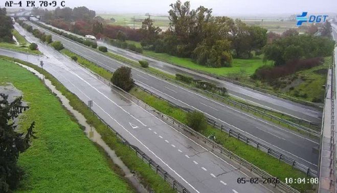 Entre los kilómetros 78,3 y 78,9 de la AP-4, a la altura de Guadalcacín, en sentido hacia la A-382 que conecta con Arcos de la Frontera, estuvo cortado un carril por el agua acumulada en la carretera, que impedía la circulación.