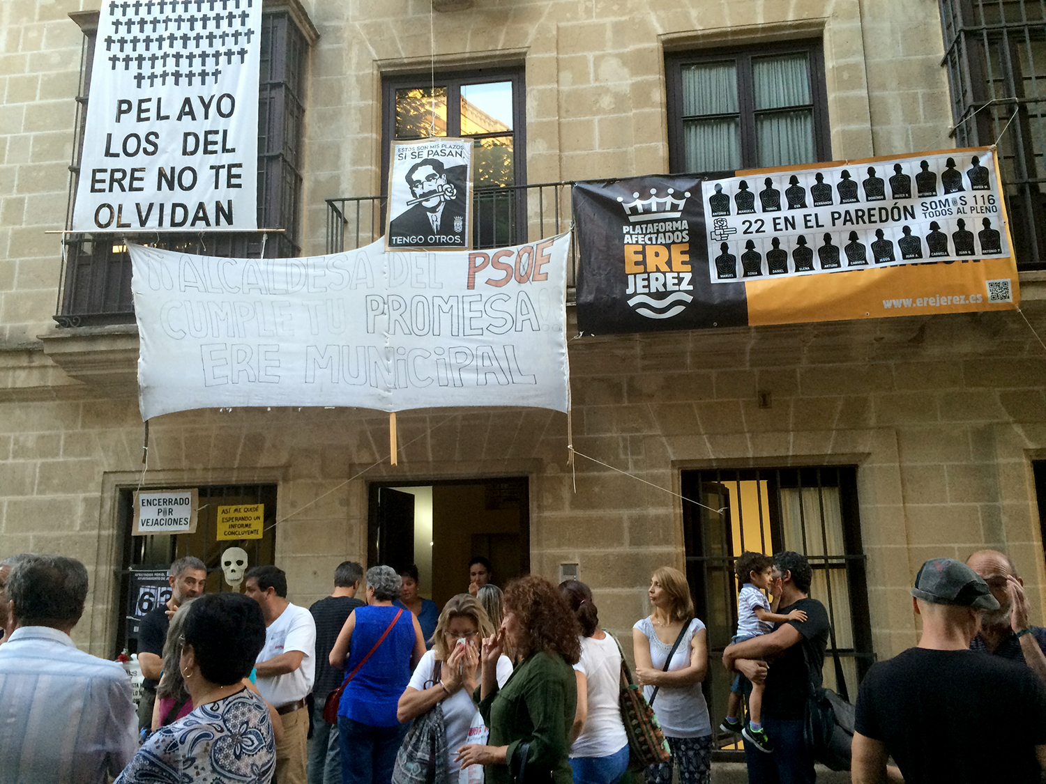 Los afectados por el ERE vieron cómo este mes se desvanecían sus esperanzas de volver al Ayuntamiento y los trabajadores clausuraron el encierro que venían protagonizando desde agosto. Tanto Ganemos como IU pidieron la dimisión de la alcaldesa por el "fracaso" en la readmisión de estos empleados. Mientras, en el PSOE, militantes del partido quieren que el partido les "escuche" y Podemos, formación que apoya a la agrupación de electores Ganemos, anuncia que no vería con buenos ojos un futuro pacto de gobierno con los socialistas. En la ciudad se presenta Andalucía por sí, un partido que pretende "empoderar Andalucía" y tienen lugar nuevas protestas de los sindicatos que, esta vez, hasta alcanzan con un lanzamiento de huevos a un miembro de la embajada británica de visita en la ciudad. También se bloquean las ordenanzas fiscales y el concejal Mario Rosado reaparece en el pleno: "La mejor almohada es una conciencia tranquila, que es lo que yo tengo".