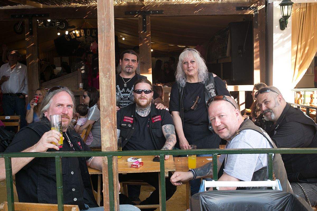 Moteros suecos, disfrutando de la Feria en la caseta de los Cherokee. FOTO: JUAN CARLOS TORO.