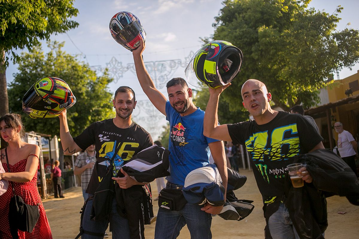 El primer día siempre es el de la toma de contacto con el albero y el de la típica ronda de reconocimiento para comprobar si las casetas que frecuentan siguen en su sitio o han cambiado de ubicación. También te sirve para darte cuenta de que mientras unas no dejan de sorprender con su decoración —espectacular un año más la de la Peña La Buena Gente, por cierto— otras tiran por lo mínimo exigible para cubrir el expediente. En el Paseo de las Palmeras nos cruzamos con otro grupo de moteros. Vienen de Málaga y afirman que les ha venido “de lujo” la coincidencia de las motos y la Feria. “Solemos venir todos los años a las dos cosas y este año nos ahorramos un viaje”, señala Carlos, aficionado de Márquez, al que espera ver en lo alto del podio este domingo.