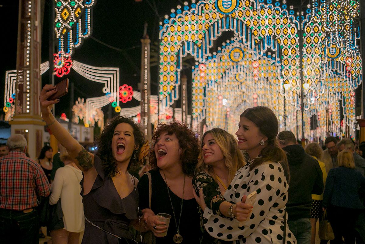 “¡Esta feria es del c…!”. La efusiva respuesta de Javi, motero onubense luciendo camiseta de Valentino Rossi, demuestra que se lo está pasando bien en la Feria del Caballo. Junto a Pepe y Francisco han llegado desde Santa Bárbara de Casa, una pequeña localidad de apenas mil habitantes. “¡Imagina la feria en mi pueblo! Allí solo tenemos una caseta!”. Son las siete de la tarde del primer sábado de Feria y la fiesta, oficialmente no ha comenzado —eso llegaría más tarde, a las diez, con la alcaldesa pulsando el botoncito para darle luz al millón largo de bombillas del Real— pero el parque González Hontoria luce como un lunes o martes —sin caballos, eso sí—, señal de que los locales tienen ganas de fiesta y los foráneos, de conocer una de las ferias más reconocidas internacionalmente.