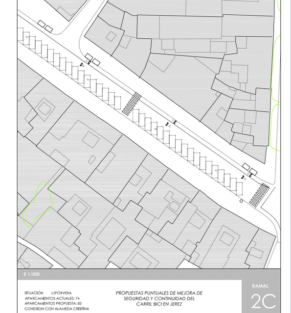 La idea de ‘Jerez en Bici’ es eliminar el ramal actualmente proyectado en Divina Pastora y calle Ponce para que el mismo pase directamente por Porvera, por lo que conectaría con el actualmente finaliza en el Mamelón y con el que está proyectado en calle Ancha. Esto supondría para el colectivo un trazado más lógico y sin tantos rodeos para llegar al centro que el que está proyectado en la actualidad y significaría que el espacio destinado a las bicicletas en sentido ascendente hacia La Victoria pasara justo por la actual zona naranja. De este modo quedaría un sólo carril de tres metros de ancho para el tráfico rodado y las plazas de aparcamiento pasarían al lado derecho en el sentido de la circulación, proponiéndose además que sean en batería en lugar de en línea. Así, calculan que de las actuales 74 plazas que tiene actualmente Porvera se ganarían nueve más hasta alcanzar las 83. En lo relativo al carril descendente hacia Alameda Cristina, éste compartiría espacio con los vehículos a motor, y además habría que trasladar al margen izquierdo en sentido del tráfico los contenedores de basura.