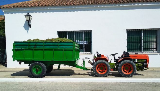 A mediodía se sale de la viña con los zapatos blancos de albariza, como tiene que ser. Las calles de Trebujena están más vivas que nunca hoy. El ir y venir de remolques cargados de uva alegra una mañana en la que muchos lugareños se acercan a los lagares para contemplar la entrega y el inicio del proceso, empieza la magia. A las 12:15 horas, de camino a las cooperativas Albarizas y Virgen de Palomares, los camiones y tractores que transportan la uva recién cogida esperan su turno en distintos lugares.